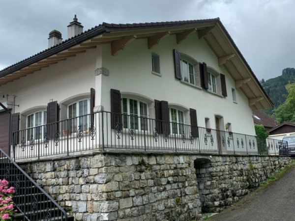 Au rez inférieur : totalement excavé, porte accès entrée et jardin, buanderie, deux caves en terre battue, local chauffage à mazout (citerne révisée en 2014 de 10000 l), chaudière combinée bois mazout neuve. Accès au 1er garage, accès au deuxième garage depuis l’extérieur, accès grande serre, local disponible, hall et escaliers accès au rez supérieur. Au rez supérieur : Appartement de 4,5 pièces, dégagement avec armoires murales, cuisine habitable, salle à manger avec grande baie vitrée avec une magnifique vue sur le château de Gruyères, cheminée de salon, accès terrasse, salle de bain avec wc, lavabo, baignoire, 3 chambres à coucher. Au premier étage, un appartement de 3.5 pièces, cuisine habitable, économat, deux chambres à coucher avec dressing et accès sur balcon, une salle de bain avec baignoire, wc, lavabo. Trappe pour accès galetas.